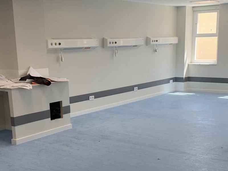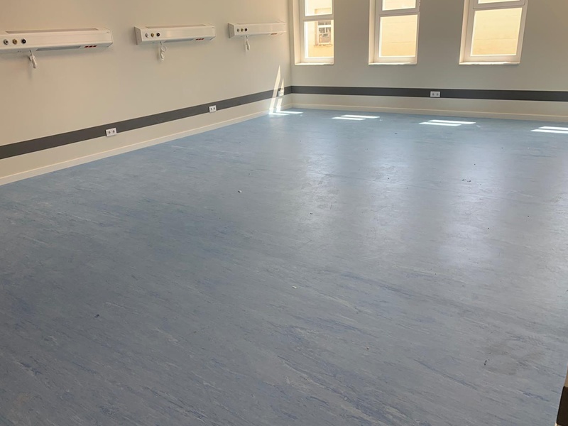 Se ha utilizado un suelo de vinilo homogéneo continuo en bobina, ideal para zonas de alto tránsito y que requieren de una alta resistencia y durabilidad, así como una fácil limpieza y desinfección.
